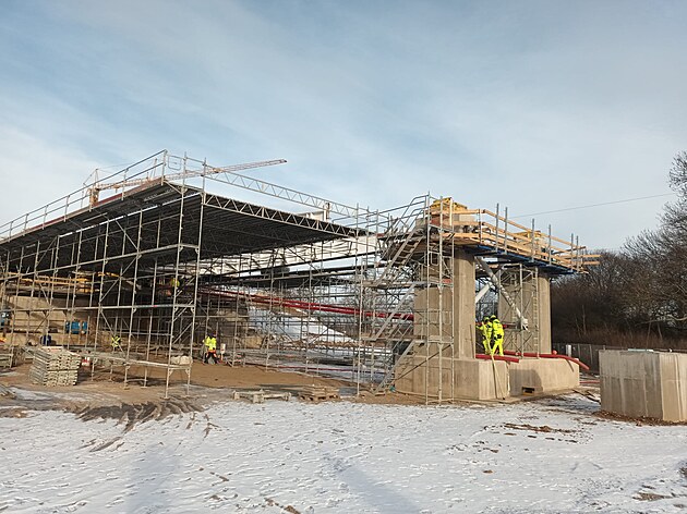 Příprava na výsun lanového mostu přes Labe v rámci severovýchodního obchvatu v Pardubicích.