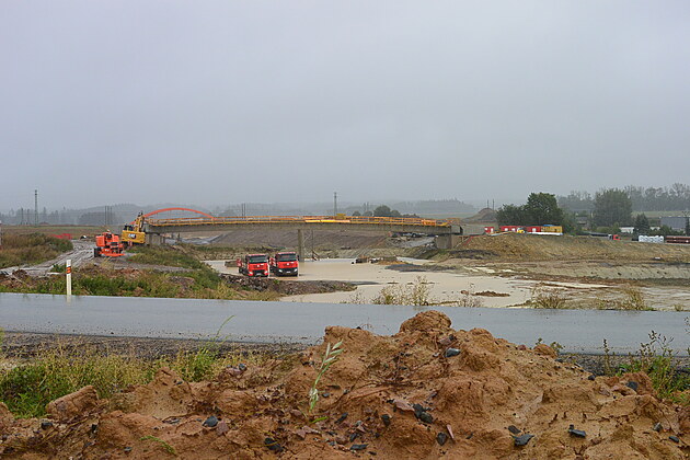 Staveniště dálnice D35 u Opatovce zaplavila voda. (14. září 2024)