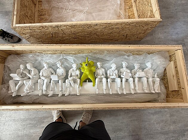 Socha inspirovaná ikonickou fotografií dělníků na traverze symbolizuje odvahu, volnost a sny. Unikátní dílo vzniklo ve spolupráci Josefa Rataje a pardubického 3D tvůrce Kamila Mertla. Prostřední figurku lze měnit. (14. července 2025)