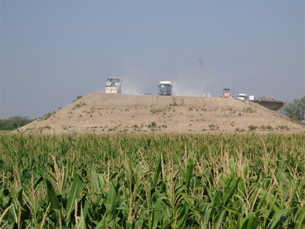 Na takřka dvanáct metrů vysokém náspu, za kterým čeká na sklizeň pole s kukuřicí, v minulých dnech přibyla jedna z posledních vrstev zeminy. Takřka krokem jedoucí stroj zvaný zemní fréza na ní mísil navezené vápno s hlínou. Tyto práce však probíhají zcela mimo dohled řidičů a nemají žádný vliv na provoz.