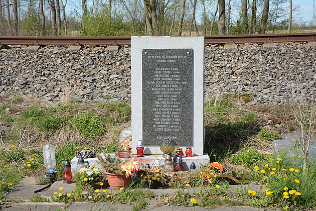 Pomník stojící na místě železniční tragédie u Krouny. (10. května 2021)