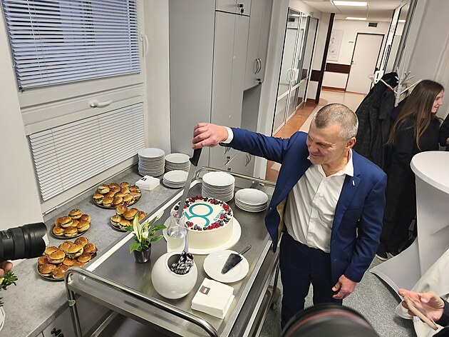 Vedoucí lékař dialyzačního střediska Petr Gorun krájí dort u příležitosti 30.výročí dialýzy v Ústí nad Orlicí. (8. prosince 2025)