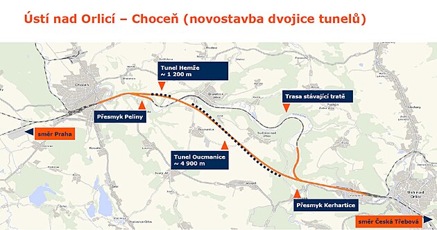 Plán nové tratě mezi Chocní a Ústím nad Orlicí.