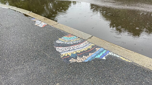 Mozaika ve tvaru ryby u Ponorky v Pardubicích je další z prací talentovaného studenta. I za deštivého počasí přitahuje pozornost kolemjdoucích. (22. července 2025)