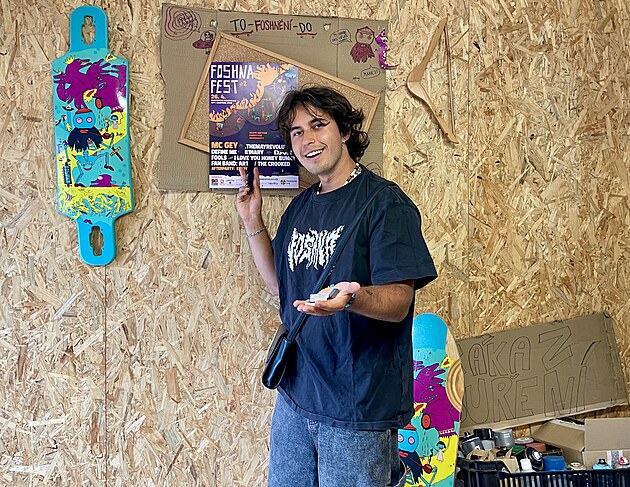 Matěj Krajíček ve Foshna garáži, kterou využívá se svými přáteli jako prostor pro tvoření a inspiraci. (22. července 2025)