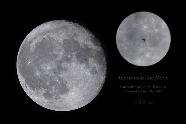 Astronom Petr Horálek zachytil na fotografii Mezinárodní vesmírnou stanici (ISS). (vlevo je složený snímek zachycující průlet ISS před Měsícem, vpravo detail stanice)