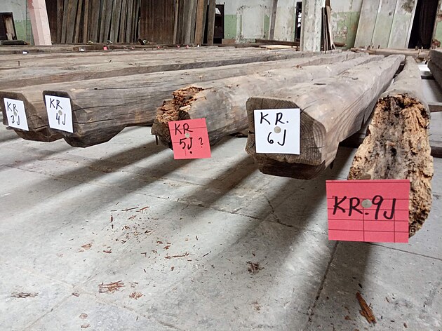 Některé dřevěné trámy roubené stodoly nepůjdou použít, proto je řemeslníci tradiční formou ručního opracování vyrobí znovu.
