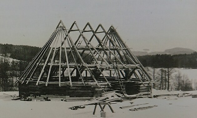 Stavba obnovené unikátní čtrnáctiboké stodoly na Veselém Kopci v roce 1973.