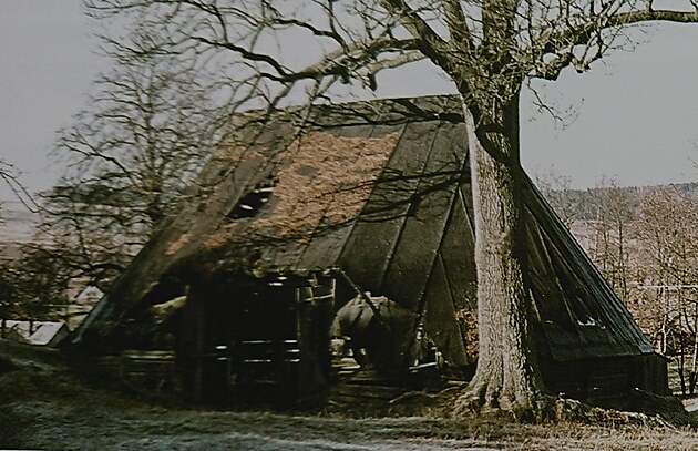 Čtrnáctiboká stodola ze Sádku u Poličky byla zachráněna na poslední chvíli. Stav v roce 1968.
