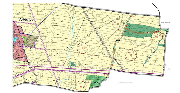 Rozmístění pěti větrných elektráren na katastru Vojtěchova (23. září 2025)