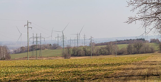 V blízkosti větrných elektráren vede koridor vysokonapěťových linek ČEPSu a ČEZu. (23. září 2025)