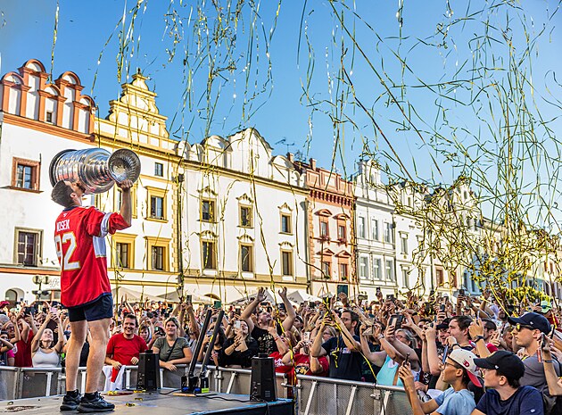Tradiční polibek poháru. Jak tradice velí, mohl s ním Tomáš Nosek strávit celý den. Ráno z něj dokonce posnídal vejce Benedikt na brunchi s rodinou. (12. srpna 2025)