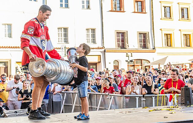 Na podiu nemohli chybět ani synové Tomáše Noska. Oba měli s sebou zmenšenou napodobeninu Stanley Cupu. (12. srpna 2025)