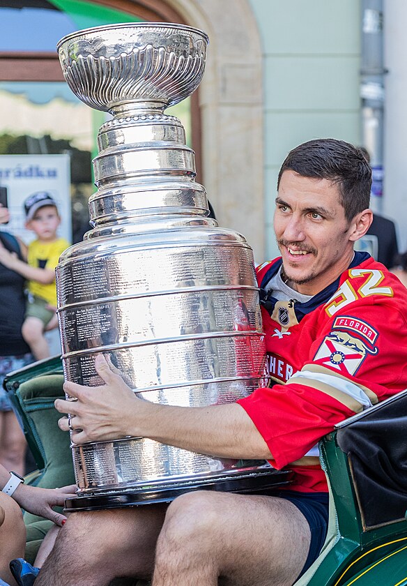 Nosek cestou na povozu držel Stanley Cup co nejpevněji. (12. srpna 2025)