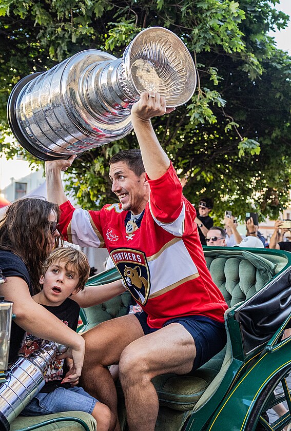Hokejový hrdina si celou akci viditelně užíval. Fanouškům Stanley Cup hrdě ukazoval ihned po příjezdu na náměstí ještě na koňském povozu. (12. srpna 2025)