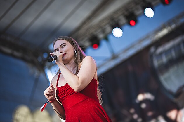 Kromě kapely Verona vystoupili i Márdi z Vypsané Fixy, Bóďa z Dukly Vozovna, ale taky zpěvačka Adéla Krátká, která v enteria areně zpívá hymnu před extraligovými zápasy Dynama (na snímku). (12. srpna 2025)