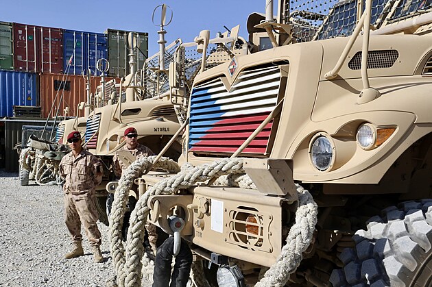 Čeští vojáci v Afghánistánu u vozů MRAP
