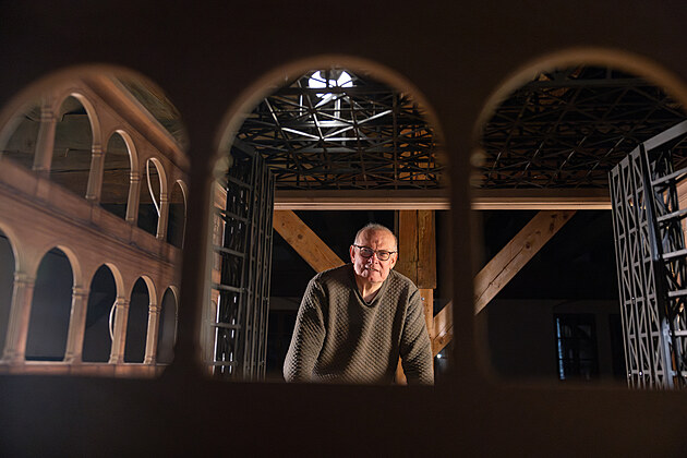 Architekt Josef Pleskot s modelem SmetaNOVÉHO sálu, jenž bude během festivalu Smetanova Litomyšl stát na druhém zámeckém nádvoří