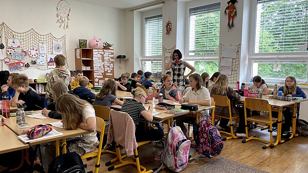 Mgr. Martina Hezká se při hodině pohybuje mezi žáky a s úsměvem se každému z nich individuálně věnuje. (2. června 2025)
