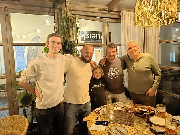 První setkání. Zleva zachránci Michal Držmíšek a Jan Čapoun s dcerou Teou, Robert Martinec a organizátor festivalu Jiří Lejhanec. (30.srpna 2025)