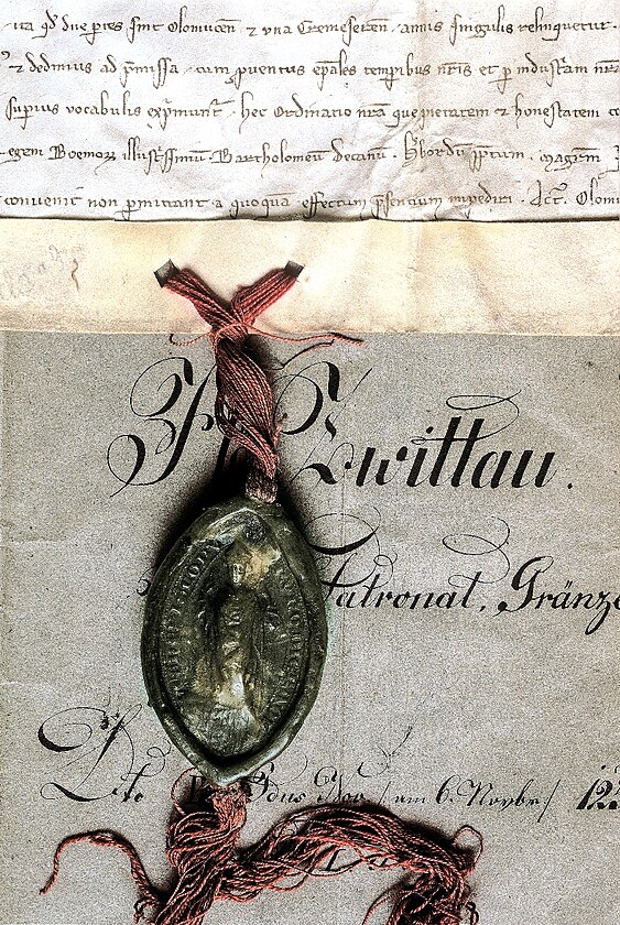 Zakládací listina města Svitavy z roku 1256 s pečetí olomouckého biskupa Bruna ze Schauenburgu. Dokument, který urovnával územní spor, poprvé zmiňuje město Svitavy.