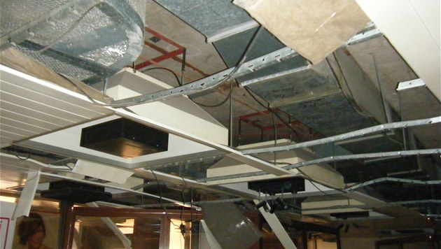 Rozebrané stropy Divadla Miroslava Horníčka a přilehlé prostory v budově plzeňského Inwestu, o jehož bourání se vede spor.