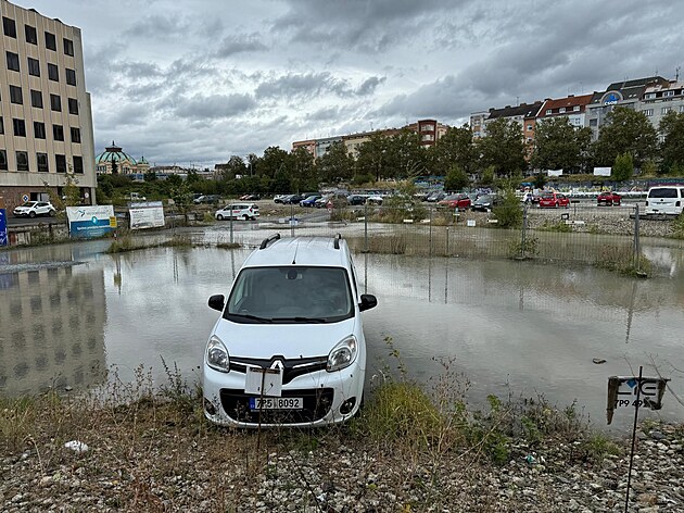 Vydatné deště vytvořily na parkovišti po bývalém kulturním domě Inwest lagunu. (14. září 2024)