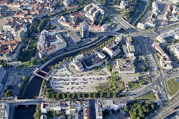 Proluka po zbořeném Domu kultury Inwest. Zastavět se má v rámci projektu AMESIDE, původní záměr investora na stavbu obchodního monobloku zastavilo místní referendum. (8. 9. 2021)