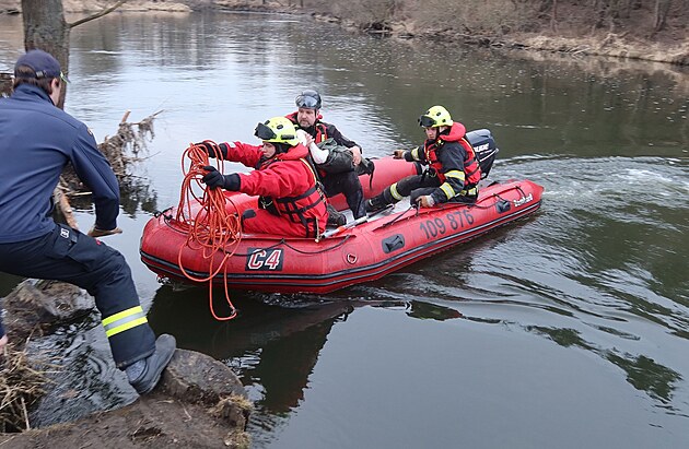 Člun s chycenou labutí přijíždí ke břehu. (25. února 2025)