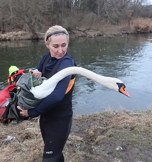 Členka ochranářského spolku odnáší labuť do auta. (25.února 2025)
