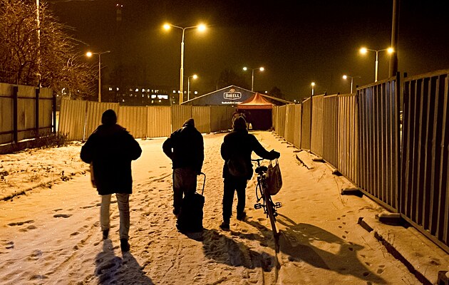 Bezdomovci přicházejí do vytápěného stanu v areálu DEPO v Plzni. Stan otevřelo město ve spolupráci s neziskovými organizacemi na začátku největších mrazů. (17. prosince 2022)