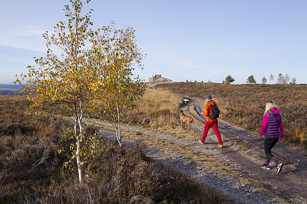 Podzim na Brdech, dopadová plocha Jordán, vrchol Houpák a bunkry přilákaly desítky turistů v době přísných protiepidemických opatření. (25. 10. 2022)