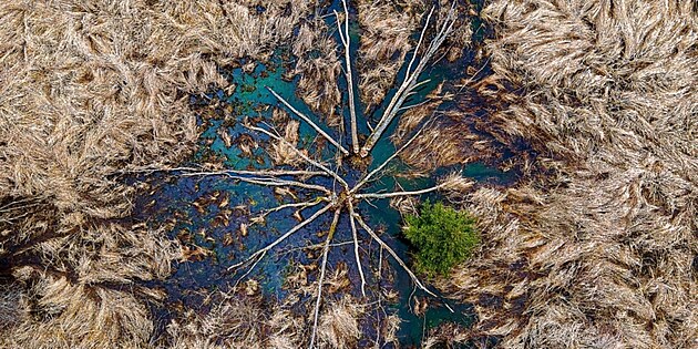 Mokřad vytvořený bobrem pod Dolejším Padrťským rybníkem v Chráněné krajinné oblasti Brdy