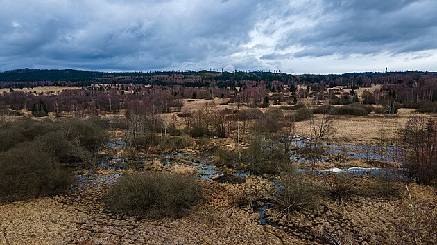 Mokřad vytvořený bobrem pod Dolejším Padrťským rybníkem v Chráněné krajinné oblasti Brdy