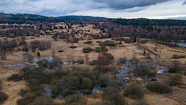 Mokřad vytvořený bobrem pod Dolejším Padrťským rybníkem v Chráněné krajinné oblasti Brdy