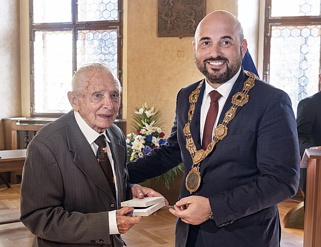 Historickou pečeť primátor Plzně Roman Zarzycký udělil výtvarníku, advokátu, spisovateli a skladateli Karlu Pexidrovi. (28. října 2024)