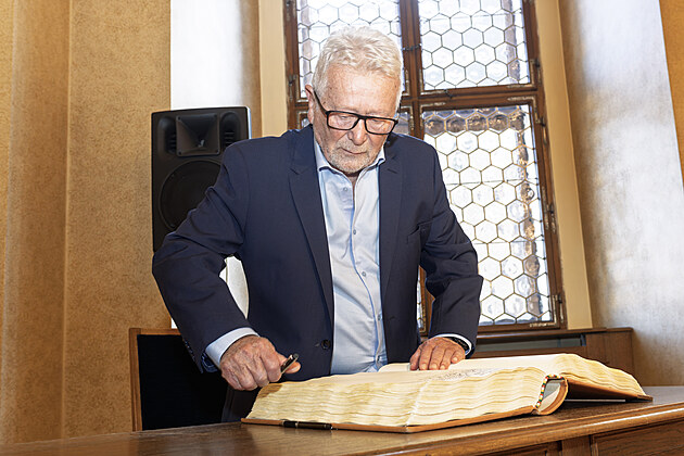 Historickou pečeť primátor Plzně Roman Zarzycký udělil zakladateli jednoho z prvních soukromých rádií v Česku Václavu Ježkovi. (28. října 2024)