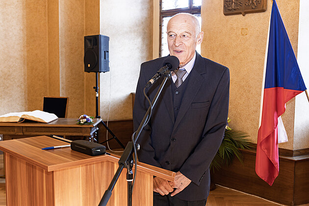 Historickou pečeť primátor Plzně Roman Zarzycký udělil výtvarníku Stanislavu Bukovskému. (28. října 2024)