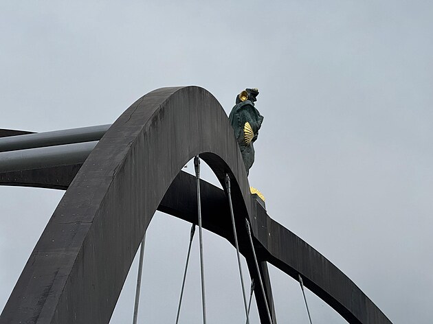 Autorem sochy sv. Jakuba na nové lávce u Chotíkova je akademický sochař Jan Hendrych. (10. září 2025)