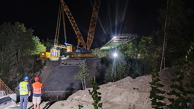 Usazování Faltusova mostu přes frekventovanou silnici z Plzně na Karlovy Vary u Chotíkova probíhalo v nočních hodinách. (21. září 2025)