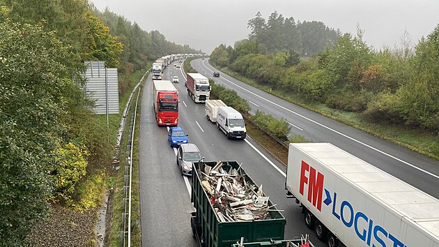 Více než pětikilometrová kolona aut se táhla od dálničního mostu u Rokycan až mezi Ejpovice a Letkov. (8. října 2025)