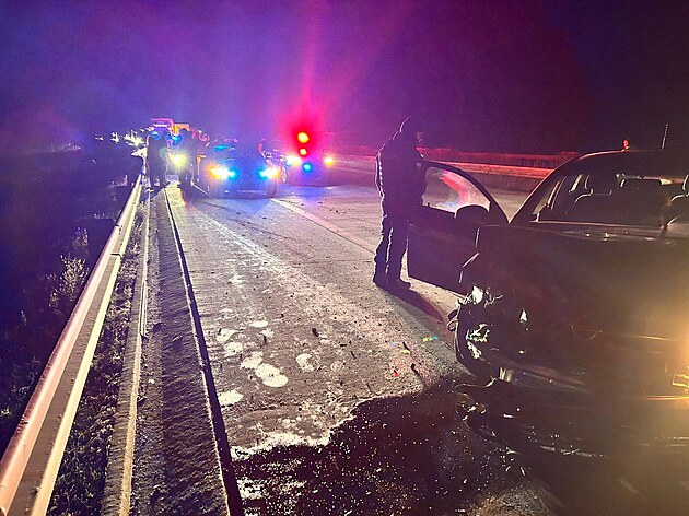 Na dálnici D5 u Heřmanovi Huti na Plzeňsku narazil ve středu večer ujíždějící řidič do policejního auta. (4. prosince 2024)