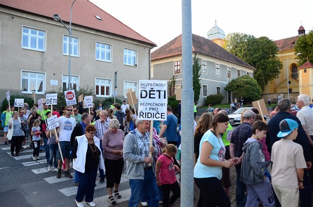 Lidé ve Chválenicích chtějí obchvat, v neděli blokovali hlavní silnici na České Budějovice. (25. září 2016)