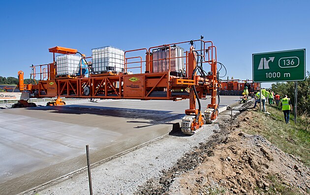 Oprava levého jízdního pásu dálnice D5 u Mlýnce ve směru na Plzeň. Stavbaři pokládají nový cementobetonový povrch pomocí obrovských finišerů. (12. srpna 2025)