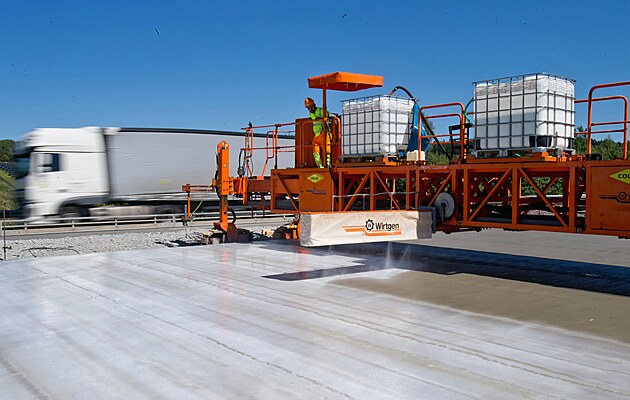 Oprava levého jízdního pásu dálnice D5 u Mlýnce ve směru na Plzeň. Stavbaři pokládají nový cementobetonový povrch pomocí obrovských finišerů. (12. srpna 2025)