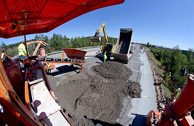 Oprava levého jízdního pásu dálnice D5 u Mlýnce ve směru na Plzeň. Stavbaři pokládají nový cementobetonový povrch pomocí obrovských finišerů. (12. srpna 2025)