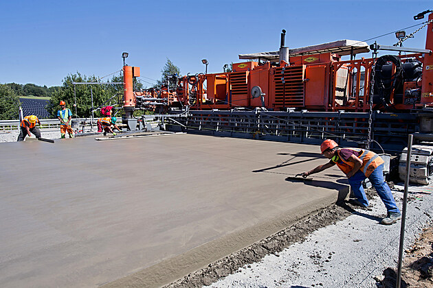 Oprava levého jízdního pásu dálnice D5 u Mlýnce ve směru na Plzeň. Stavbaři pokládají nový cementobetonový povrch pomocí obrovských finišerů. (12. srpna 2025)