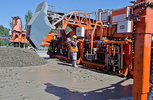 Oprava levého jízdního pásu dálnice D5 u Mlýnce mezi 139,64. až 129,9. kilometrem ve směru na Plzeň. Stavbaři pokládají nový cementobetonový povrch pomocí obrovských finišerů. (12. srpna 2025)