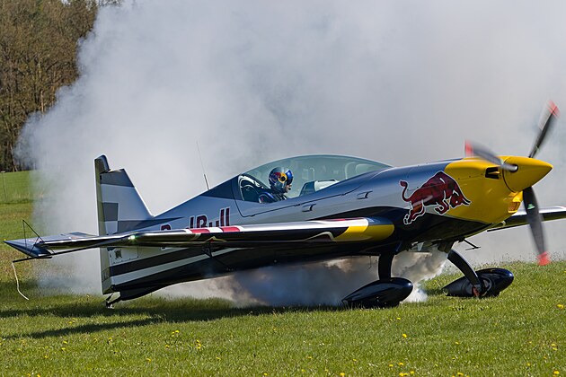 Martin Šonka, legenda mezi akrobatickými piloty, ani letos nechyběl na Dnu ve vzduchu v Plasích na Plzeňsku. Diváky opět bavil svými vtipnými komentáři během letu. (26. dubna 2025)