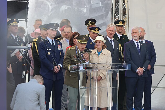 Pietního aktu u památníku Díky, Ameriko! v Plzni se účastnil prezident Petr Pavel a belgický král Philippe. Na snímku u řečnického pultu stojí generál ve výslužbě Miloslav Masopust. (6. května 2025)